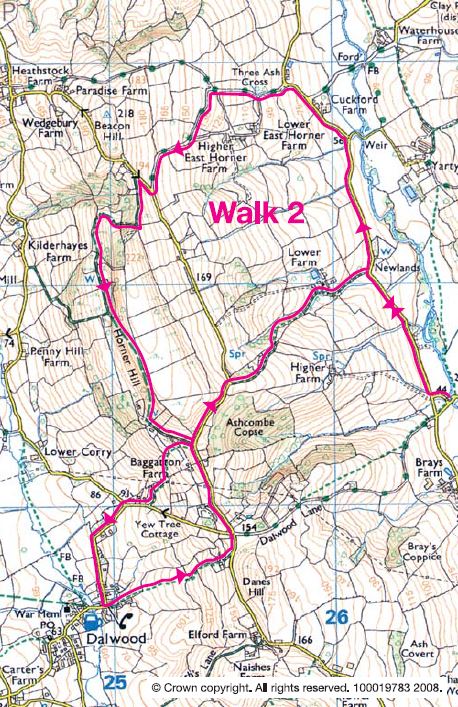 Turn left on the lane or, alternatively if you want to visit the Tucker’s Arms at Dalwood, turn right at through a metal gate at the footpath, and into the grounds of Baggaton Inn (an old smuggler’s and cider inn) following the path downwards for approx. 600 yards until you reach the road. Turn right and you are on the edge of Dalwood village with the pub further on over the bridge on your left. Retrace your steps back over the bridge and follow the footpath on your right uphill. Tun left at the top at the road back to the start of the diversion – distance two miles.